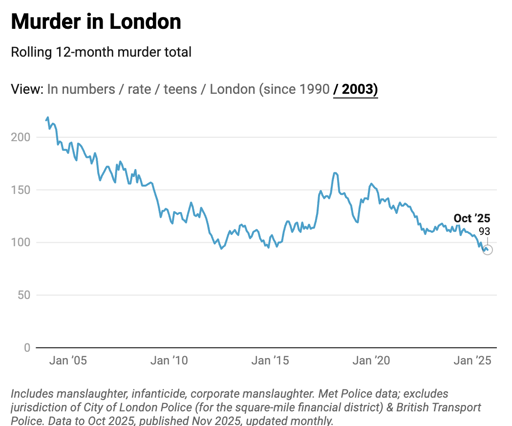 dwouu@lemmy.world · edit-215 days ago93 murders in London (pop: ~9million) in 12 months. London's murder rate is now at the lowest level for decadesplus-squarelemmy.worldimagemessage-square8linkfedilinkarrow-up1202arrow-down17