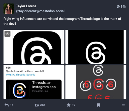 Text from post: Right wing influencers are convinced the Instagram Threads logo is the mark of the devil Link to original tweet