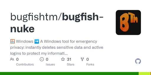 Tablaste@linux.community to Privacy@lemmy.mlEnglish · 7 months agoGithub - bugfishtm/bugfish-nuke: A Windows tool for emergency privacy: instantly deletes sensitive data and active logins to protect my information during unexpected searches or house warrants.github.comexternal-linkmessage-square25linkfedilinkarrow-up173arrow-down13