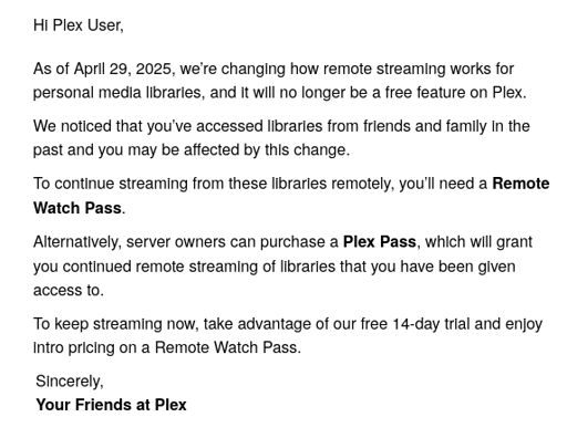 Edit I have a Plex Pass. More comments saying “Just buy a plex pass” are seriously not getting it. I have a Plex Pass and my users are still getting this.