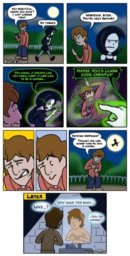 The witch turned the creep into a woman and the spell was complete by the time she flew away. Unfortunately, like many women, the creep was born with the body of a man (she’s AMAB). Maybe the witch could have changed her body, too, but that would have made things far too easy, given that the point of the curse was to teach her empathy.