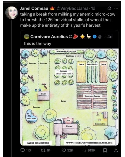 The interesting thing about Seymour’s one acre compared to the prepper fantasy in the meme is that he doesn’t try to pretend an acre is “self sufficient”. He optimizes the space for crops that make a big difference to his quality of life - fresh vegetables take up almost half his diagram, for example - instead of putting in a few tiny plots of grain and a duck pond. He has a cow in the same space as the meme does but notes he’ll have to buy fodder for it because that’s not enough land to feed a cow - but he’s cool with that because fresh milk is so important to him…