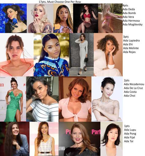 minus-squareYukioMishima00@lemmynsfw.comOPlinkfedilinkEnglisharrow-up1·29 days ago17pts Ada Vera 4 Ada Lapiedra 3 Ada De La Cruz 2 Ada Pong 1 Ada Hermosa 4 Ada Melinte 3