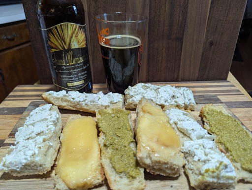 Fresh baked bread, goat cheese, pesto, smoked fontinella. 18 year old barley wine that sucked when it came out but is awesome right now.