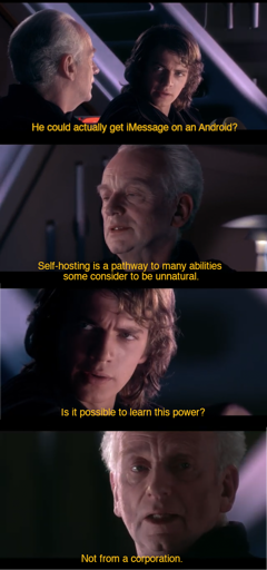 In my case, I worked for someone who only communicated via iMessage. When I got hired they said, “Either get an iPhone or figure out some magical way to get iMessage on Android.”