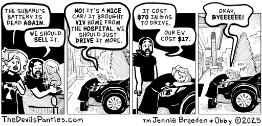 It isn’t when you have an EV. I just had this conversation with my wife a few days ago. My EV is $22/mo in electricity with my commute. My old gas car was $150/mo at best. What the comic leaves out is the cost of insurance on the EV being about $150/mo and my old car was dirt cheap so it’s almost a wash. The EV is a hell of a lot more fun to drive though.