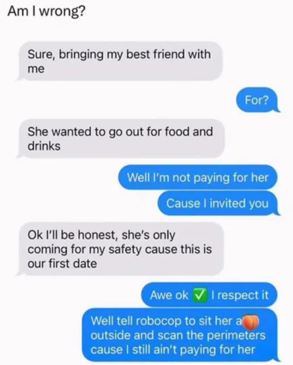 Like the guy defenitely comes off as a dick but also if you check out conventional social media you will see guys who talk about being expected to pay for not just the girl but also their friend, and you will see girls talk about how if she brings a friend for protection then the guy should pay for the friend too.