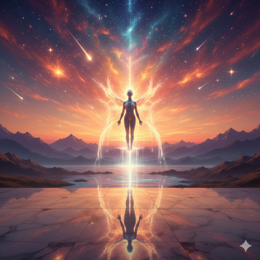 A moment suspended between dream and divinity — a scene where the sky burns with golden fire and violet mist, and a celestial figure stands amidst reflections of eternity.