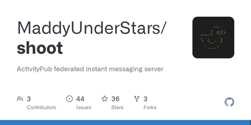 Teknevra@lemmy.world to Fediverse@lemmy.mlEnglish · 1 month agoGitHub - MaddyUnderStars/shoot: ActivityPub federated instant messaging servergithub.comexternal-linkmessage-square9linkfedilinkarrow-up115arrow-down15file-text