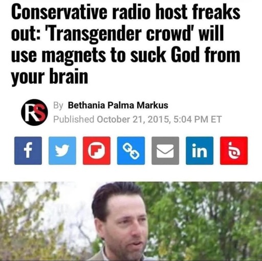The actual article https://www.rawstory.com/2015/10/conservative-radio-host-freaks-out-transgender-crowd-will-use-magnets-to-suck-god-from-your-brain/ and a press release for the referenced study https://www.york.ac.uk/news-and-events/news/2015/research/psychologist-brian-magnetic/