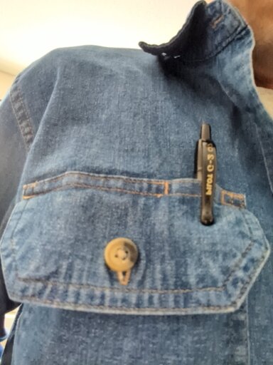 There’s a little hole in the flap of the pocket where I can put my favourite cheap pen, a Pilot G-2. This shirt is already comfy. Now it’s extra useful too.