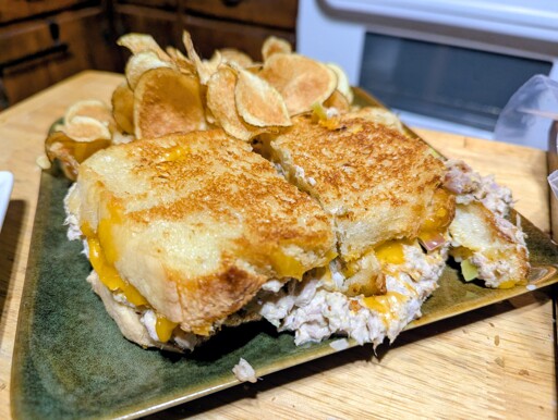 Homemade potato chips. Fresh baked bread. Cheddar. The tuna mix is tuna, pepperoncini, pickle relish, red onion, brown mustard, mayo.