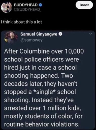 **not sure if some replies are missing my point or just talking past it. I’m not saying school cops are a good thing I’m saying the tweet is blatantly factually wrong and should not be promoted.