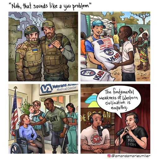 Seethe harder, the US military does have extremely positive moments. There’s absolutely nothing negative about the US helping Ukraine defend itself from it’s evil genocidal neighbor. There’s nothing wrong with the US freeing Europe from the Nazis and then later from the Soviets. There’s nothing wrong with the US Navy ensuring freedom of global trade and navigation. That’s not propaganda, that’s reality. Does that mean everything the US military has done is positive? Of course not, there’s a lot of cruelty in there too. However, pretending that the US military has no positive achievements shows that you’re the one who’s drowned in pure unapologetic propaganda. This comic serves to highlight the positive examples to disprove the notion spread by Musk and Rogan that empathy is a weakness, it’s a strength.