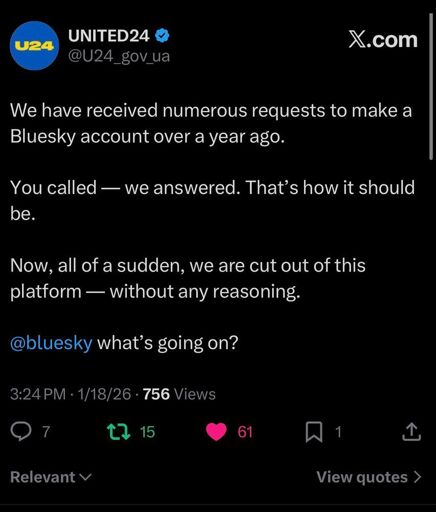 Just in case someone is not up-to-date with the latest Bluesky scandal, they have just suspended the account of UNITED24