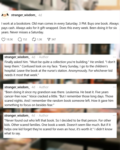 I found an FB group for “Books for BrAvery” and it seems like it could be the one from the story. Even if not, it still looks like a real thing, so I’m pretty sure that someone is donating books to children’s hospital, which is still pretty wholesome, in my opinion