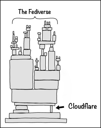 This image is inaccurate, because it suggests Cloudflare is a small block. The original xkcd makes more sense, because it is a project run by a single person. To represent Cloudflare, it should be a huge block given it’s a very large company with a market cap of $69 billion.