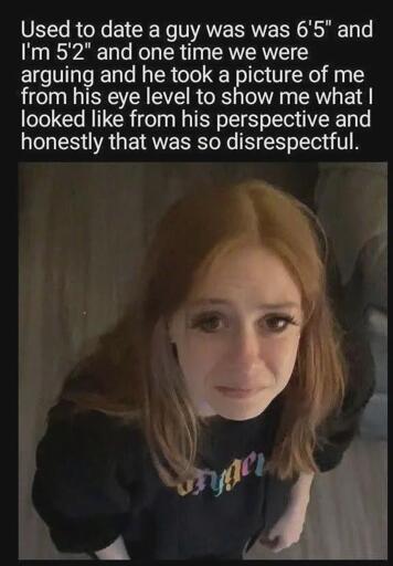 My wife’s 4’9" and I’m 6 ft and this is never the view I see. That Delta height is exactly the same as what the op height differences is. If I’m looking down and she’s looking up our faces are only about a foot apart. Op’s picture makes it look like it’s 2 ft or more.