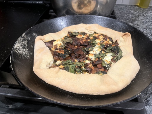 Mushroom galette with farmer’s cheese, onion, and dandelion greens. I ate it with a vin de France from La Rocalière, in northern Rhône, which was better than my dough. Flavor on the dough was nice, texture was decent to good, but I’d have been smart to use an egg wash.