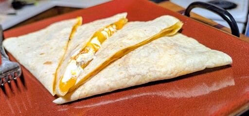 Super large tortillas filled with stir fried onions and carrots, sour cream, cheddar and pepper sauce.
