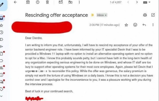 Devin informed me that Windows laptops are mandatory and that there no exceptions. Unfortunately, this does not align with my requirements stated during the interview process: Linux or Mac are my operating systems of choice.