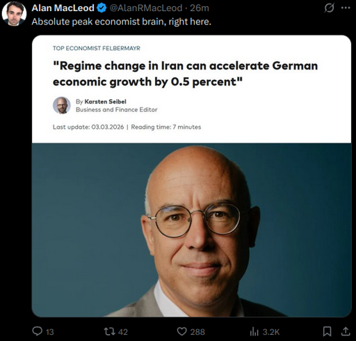 Seibel might be arguing that it’s a good thing 1000s of people got killed in the Middle East by the rogue heads of 2 nuclear-armed, failed democracies, because it’s likely to make the global economy grow. He might be arguing that it’s a terrible thing, and the available data suggesting it will lead to growth in the global economy exposes a perverse incentive that the global community needs to address. Has anyone sought out the article to check what his actual point is, or are we all just throwing darts at his face based on decontextualised screenshots of a headline he probably didn’t write himself (editors usually do that)?
