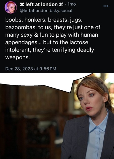 Something so sexy about the concept of a lactose intolerant person being scared of some big swinging tiddies